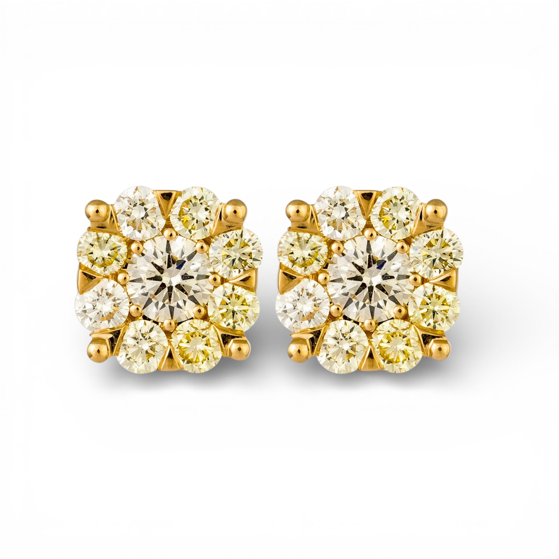 Exquisite stud earrings in a radiant yellow gold setting, featuring a cluster of round brilliant cut diamonds. The composition of the diamonds and the setting provides timeless elegance.